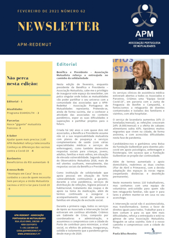 A Benéfica e Previdente teve o privilégio de colaborar nesta edição da newsletter da APM-RedeMut, a Associação Portuguesa de Mutualidades que nos representa, com um testemunho da nossa intervenção e o modo como temos superado os desafios impostos pelo Covid-19.